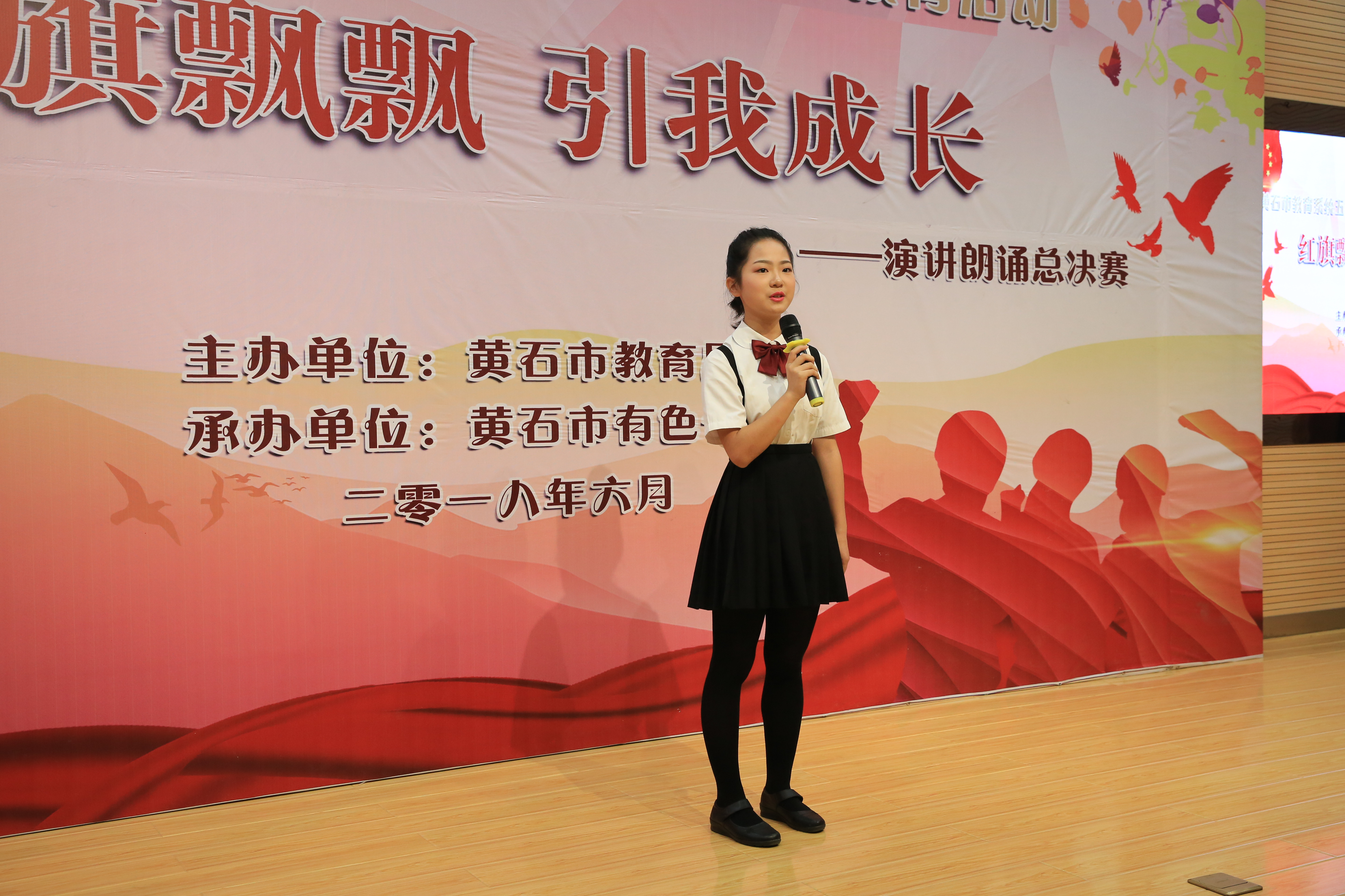 此次活动以“红旗飘飘,引我成长”为主题,分演讲、朗诵两个类别,由小学、初中、高中三个学段的选手参加。经过层层选拔,共有来自全市各县(市)区学校和直属学校一百二十多名同学参加了决赛。比赛中,选手们从近代中国的苦难历程、中国特色社会主义伟大成就、复杂的国际形势和平安定国内环境等方面进行讲述,说明只有在中国共产党的领导下,才能实现国家富强、民族振兴、人民幸福。同学们或深情款款,或慷慨激昂,表达了当代学生爱党爱国之情,并立志争做“五好小公民”、成人成才、精忠报国。经过激烈紧张的角逐,各个学段每个类别评出特等奖2名,一等奖4名,二等奖6名,三等奖若干名,其中大冶金山店镇小学黄思琪、阳新富川小学张梓宜;阳新实验中学吴雨馨、黄石八中项思语;黄石二中董可、黄石二中潘昭同学分别获得演讲比赛小学、初中、高中组特等奖;市府路小学李卓尔、铁山小学王昱皓;有色中学赵克寒、黄石实验中学梅子妍;黄石二中宛之璋、黄石有色一中叶超凡同学分别获得朗诵比赛小学、初中、高中组特等奖。