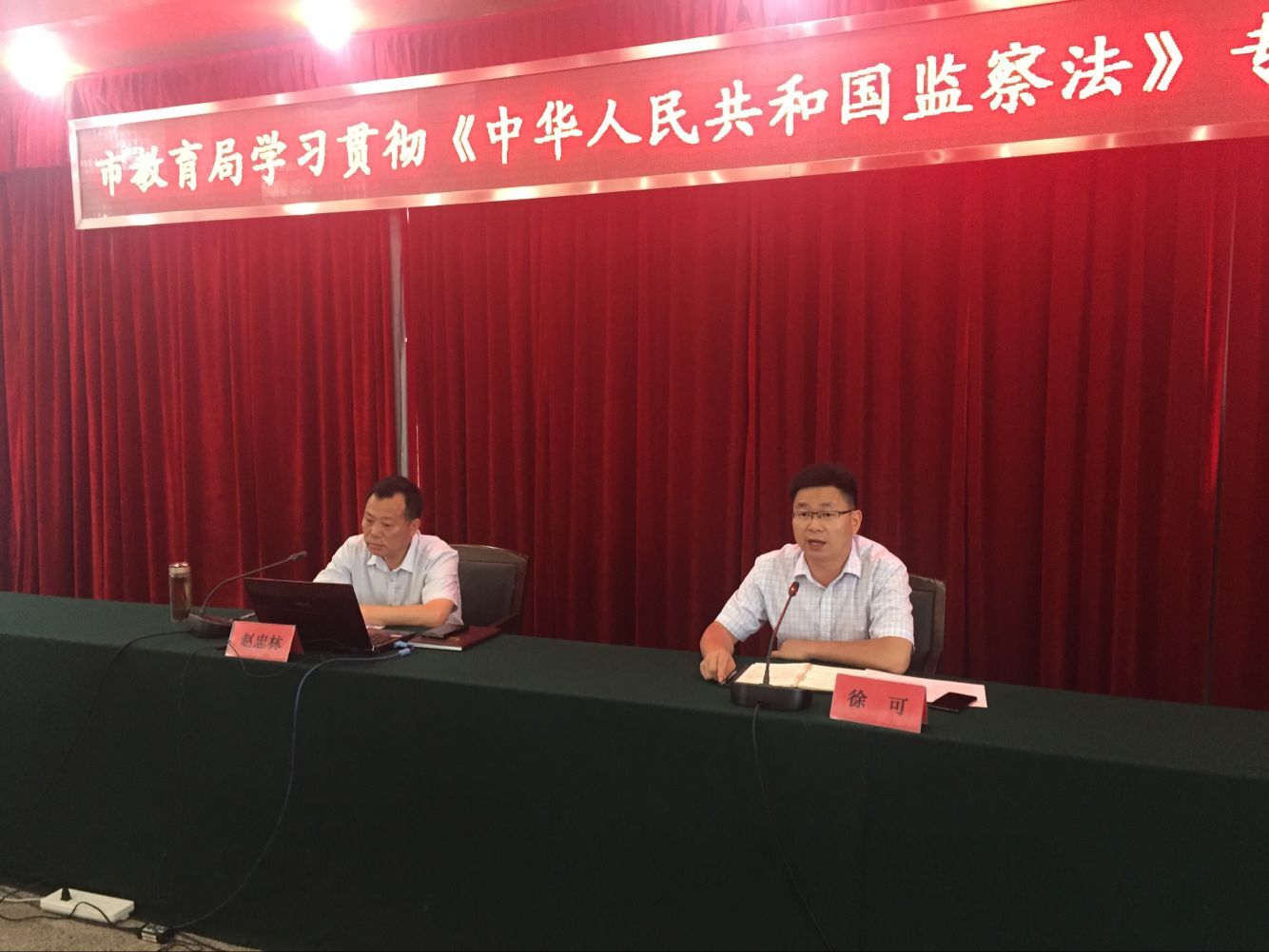 为深入学习领会《中华人民共和国监察法》的精神实质和核心要义,增强党员干部的法治素养,牢固树立依法治教的理念,不断提高依法监察的能力。5月24日下午,市教育局举办学习贯彻《中华人民共和国监察法》专题辅导报告会。会议由市教育局党组成员、副局长徐可主持,市教育局领导班子成员及机关全体干部,各直属学校(单位)领导班子成员、党政办主任、基层党支部书记参加了会议。