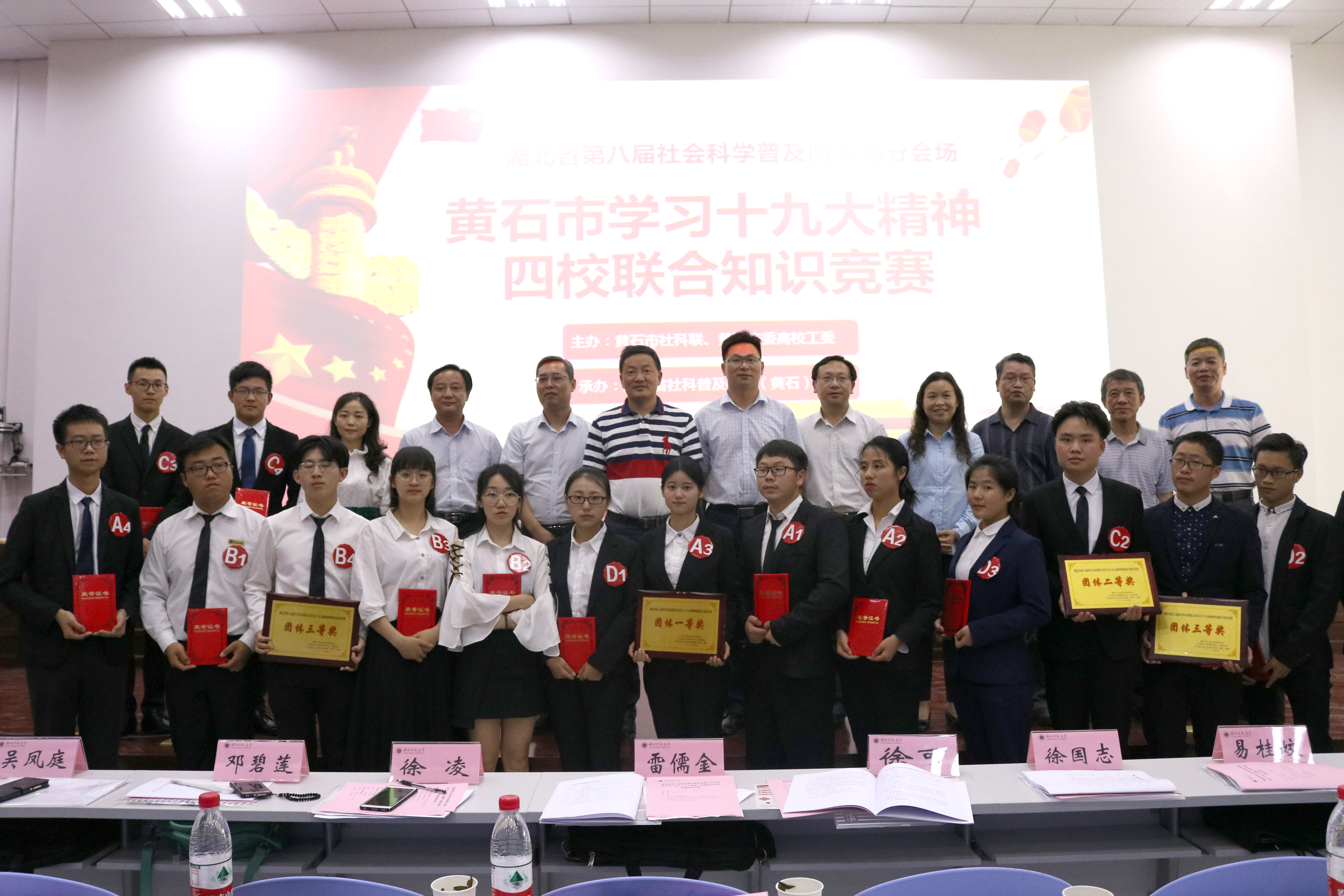 5月24日下午,由黄石市社科联、黄石市委高校工委主办,湖北省社科普及教育(黄石)基地承办,湖北师范大学、湖北理工学院、湖北师范大学文理学院、湖北工程职业学院四校“学习十九大精神”知识竞赛在湖北师范大学文都大讲堂举行。校党委常委、副校长、市社科联主席雷儒金出席活动并讲话。市委高校工委副书记、市教育局副局长徐可,市社科联专职副主席徐凌出席活动并为获奖团队颁奖。