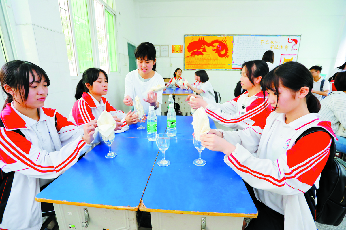 只见职教老师的双手上下飞舞,将一块块餐巾折叠成形式各异的花朵,那娴熟的技法就和变魔术似的。