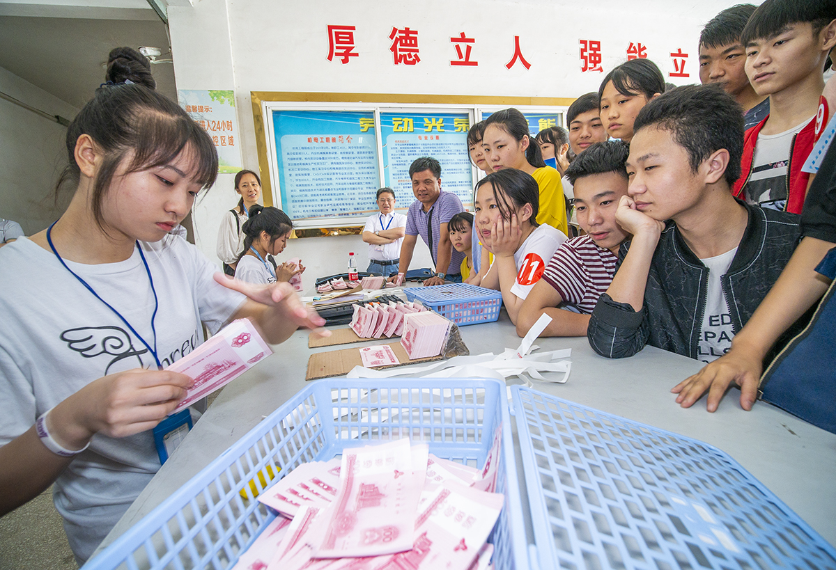 听着纸币“唰唰唰”的声音,职校志愿者正在点钞训练,让参与体验的学生们眼花缭乱。