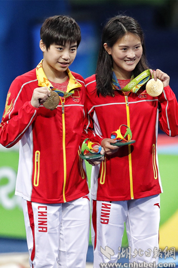 在里约奥运会夺冠的刘蕙瑕(左)(黄石市教育局供图)