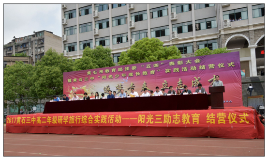 5月4日下午,黄石市教育局团委“五四”表彰大会暨黄石三中“阳光少年成长教育”实践活动结营仪式在黄石三中隆重举行。市教育局副局长周学君、黄石三中党委书记、校长吕伟胜、黄石市龙凤山中小学校外教育活动中心领导和市教育局相关科室人员出席了会议。各直属高中学校的分管领导、团委负责人以及黄石三中高二年级全体师生、家长。会议由黄石三中德体卫艺处主任赵川主持。