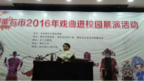 11月21日上午,由中共黄石市委宣传部主办,黄石市教育局、黄石市文新广局和黄石市文学艺术界联合会承办的“戏曲进校园”展演活动在黄石二中报告厅举行。