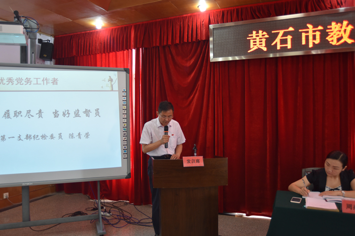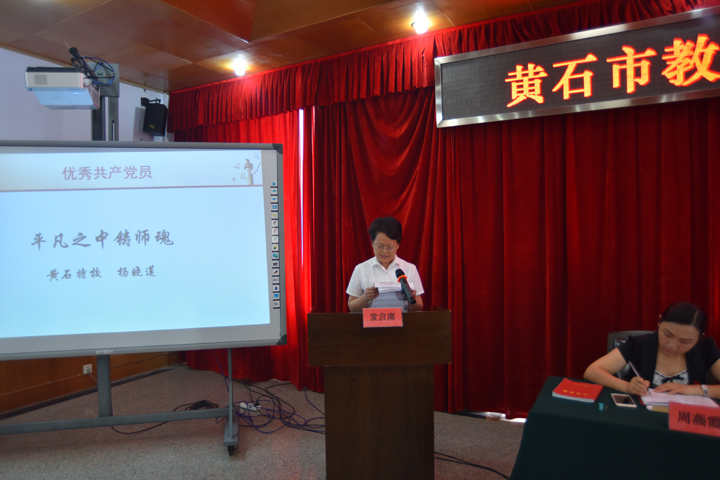 大会在庄严的国歌声中拉开帷幕,全体党员干部佩戴党徽,重温了入党誓词。市教育局党委委员、副局长徐可在表彰大会上宣读了市教育局党委关于对做出突出成绩的10个先进基层党组织、28名优秀党员、10名优秀党务工作者和10名优秀基层党组织书记表彰的决定。随后,大冶华中学校等先进基层党组织、优秀共产党员、优秀党务工作者、优秀基层党组织书记代表分别交流发言。