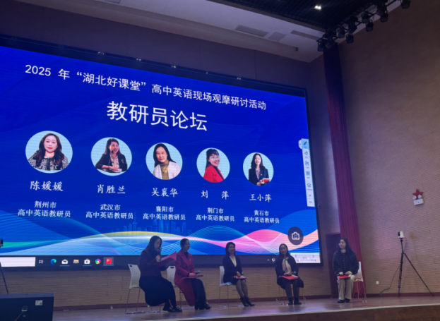 教研员圆桌论坛上,五位地市级教研员代表:荆州市的高中英语教员陈媛媛,荆门市的高中英语教研员刘萍,武汉市的高中英语教研员肖胜兰,襄阳市的高中英语教研员吴襄华,黄石市高中英语教研员王小萍,围绕“高中英语深度教学、科技赋能教学”展开深度研讨。其中,黄石市高中英语教研员王小萍从教学路径创新、技术融合实效、“教学评”一致性等维度进行专业剖析。