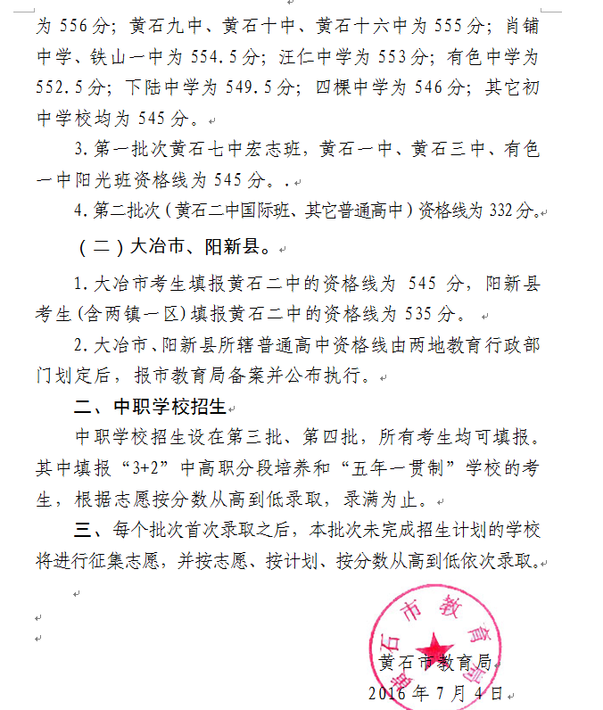 市教育局关于公布2016年高中阶段学校招生分数线的通知